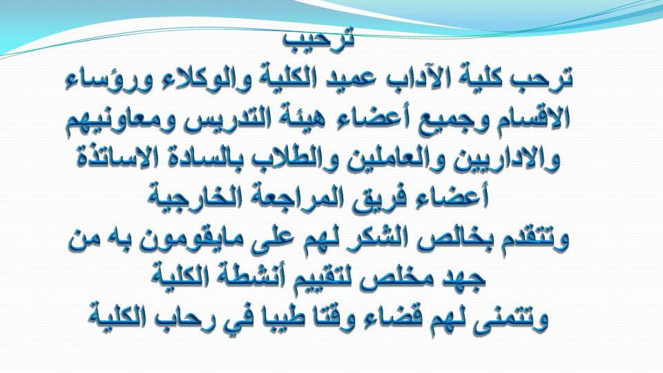ترحيب بالسادة الأساتذة أعضاء فريق المراجعة الخارجية 11 مايو 2013 ترحيب بالسادة الأساتذة أعضاء فريق المراجعة الخارجية