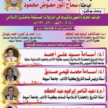 The Faculty of Literature held a session to discuss the message of the doctor, presented by researcher Samah Anwar Mouawad, which specializes in Islamic history entitled Sects of Crafts and Professions and their influence in independent states in the Isla