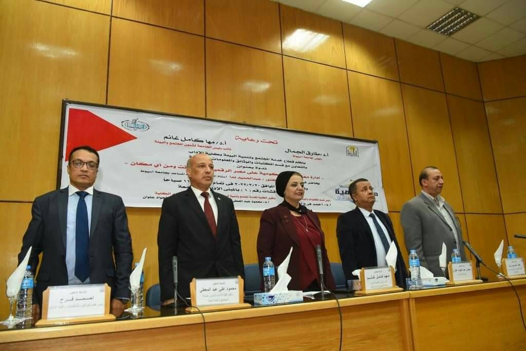 This came through the launch of the seminar "Managing your government transactions on digital Egypt at any time and from any place" organized by the community service and environmental development sector in the Faculty of Arts in cooperation with the Department of Libraries, Documents and Information at the College under the auspices of Dr. Tarek Al-Jamal, President of Assiut University, Dr. Magdi Abdul Jawad Alwan, Dean of the Faculty of Arts and in the presence of Dr. Mahmoud Abdel-Muti, Undersecretary of the College for Community Service and Environmental Development, Dr. Ahmed Faraj Ahmed Head of the Department of Libraries, Documents and Information, Dr. Abdul Muti. Hamid Nada is an associate professor of documents and archives at Assiut University, as well as deans of colleges at the university and a group of faculty members and students from the university.