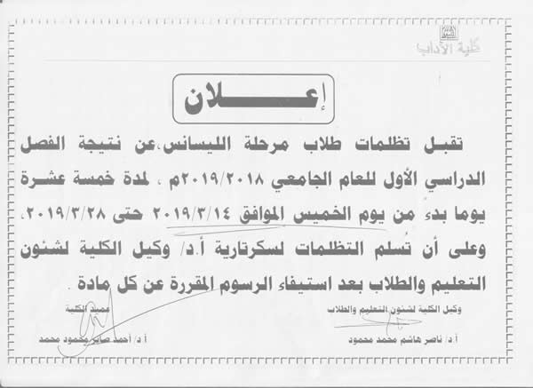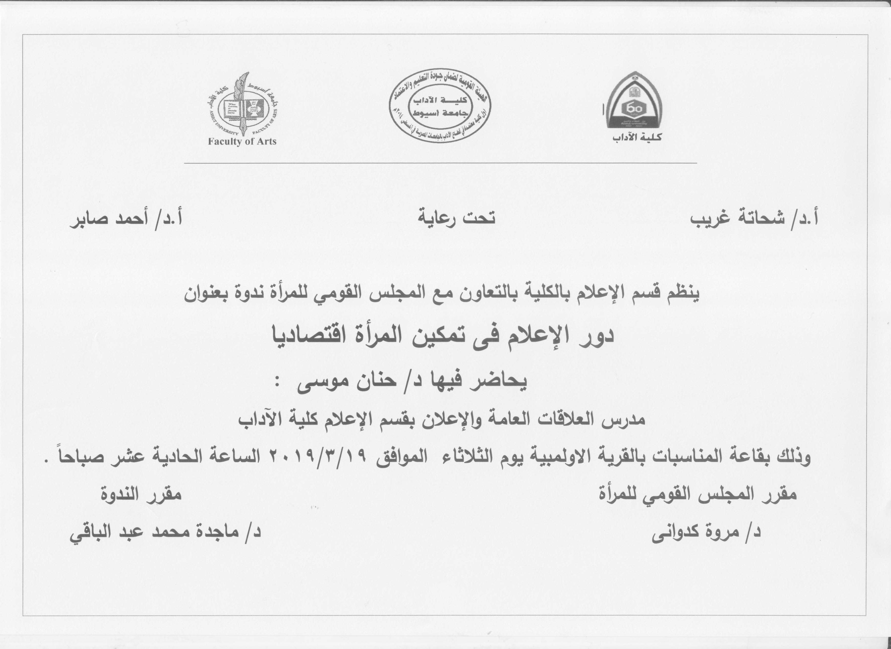 Held at the Faculty of Arts on Saturday, March 23, 2019 in the Hall of Prof. Dr. Ezzat Abdallah session of the doctoral thesis presented by the researcher Doaa Salah Riad the assistant lecturer in the Department of History of the Faculty of Arts under the title  "Manifestations of corruption and reform in the public sector companies general commercial Group 1971-1981 Historical documentary study  "