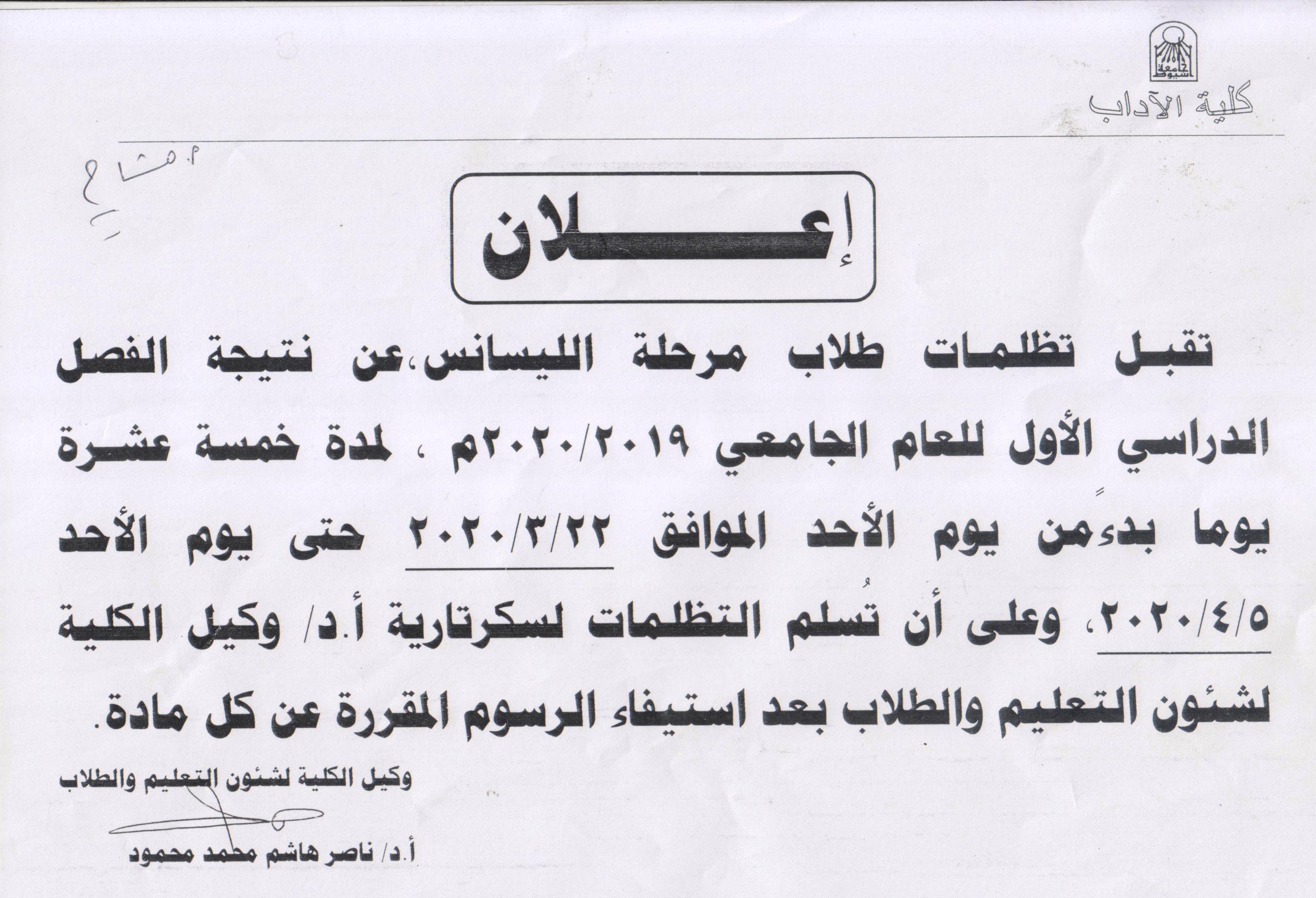 Open the door of grievances for bachelor's degree students for the results of the first semester of the academic year 2019-2020 22 March 2020 Open the door of grievances for bachelor's degree students for the results of the first semester of the academic year 2019-2020