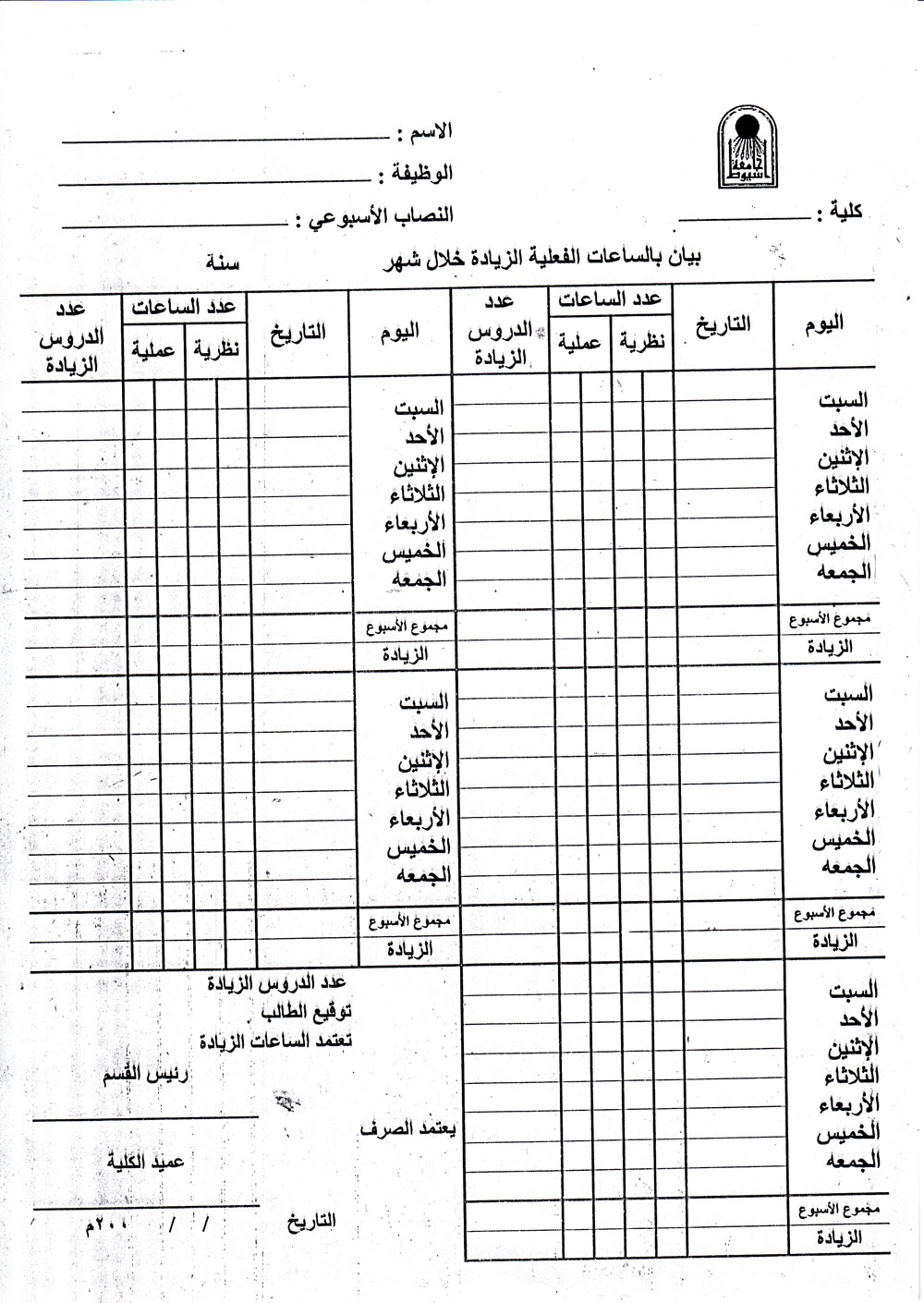 بيان بعدد الساعات الفعلية الزيادة خلال الشهر.