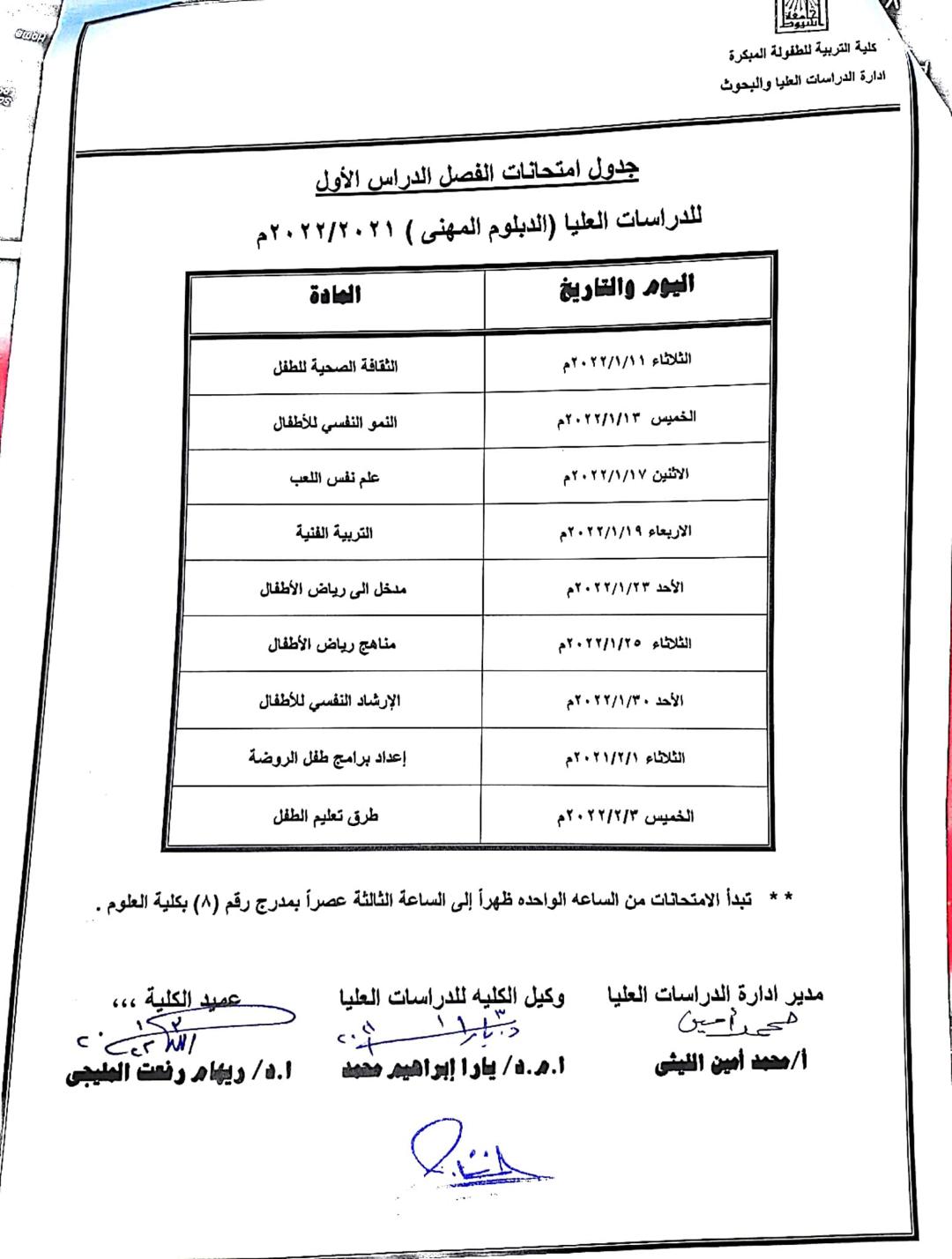 جدول امتحانات الدراسات العليا الدبلوم المهنى 21/22