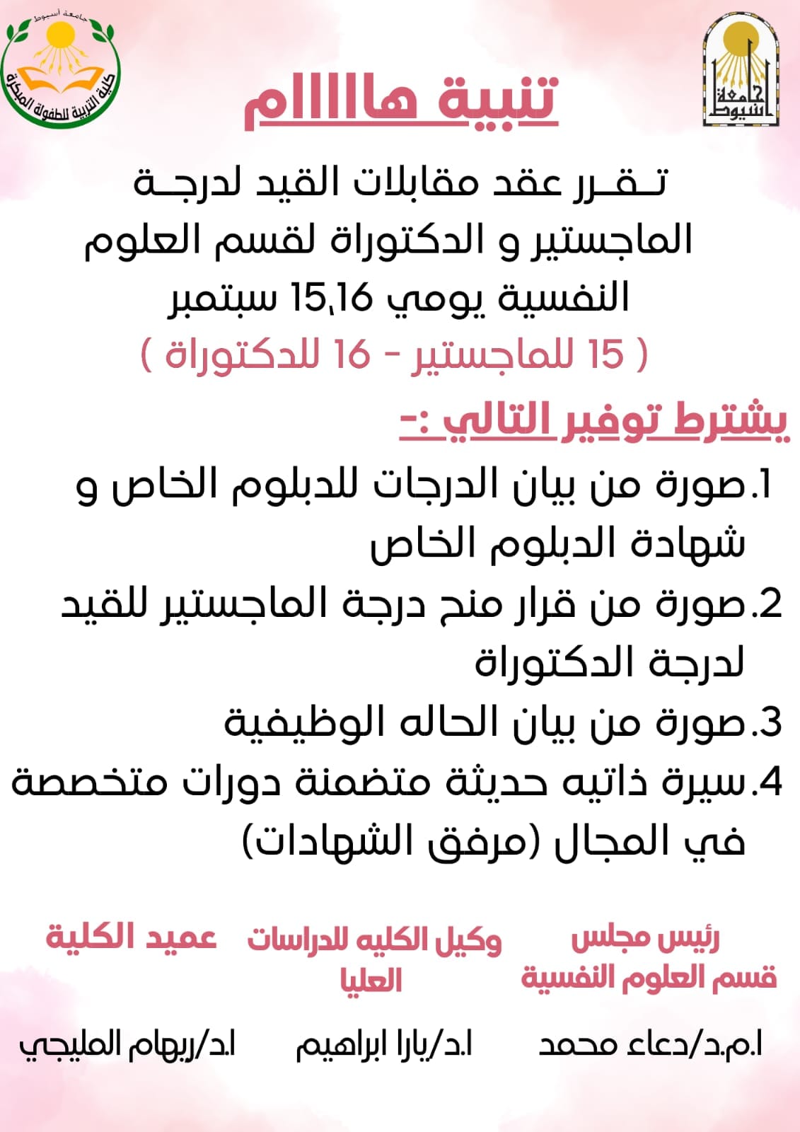 موعد مقابلات المتقدمين لقيد الماجستير و الدكتوراه لقسم العلوم النفسية بكلية التربية للطفولة المبكرة جامعة أسيوط