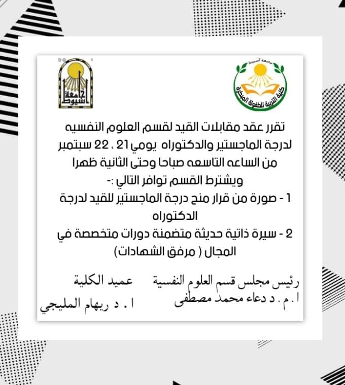موعد مقابلات المتقدمين لقيد الماجستير و الدكتوراه لقسم العلوم النفسية 7 سبتمبر 2022 تم تعديل موعد مقابلات المتقدمين لقيد الماجستير و الدكتوراه لقسم العلوم النفسية بكلية التربية للطفولة المبكرة جامعة أسيوط و سوف يتم الإعلان عن موعد مقابلات الأقسام الأخرى تباعا مع تحياتي عميد الكلية أ د / ريهام المليجي