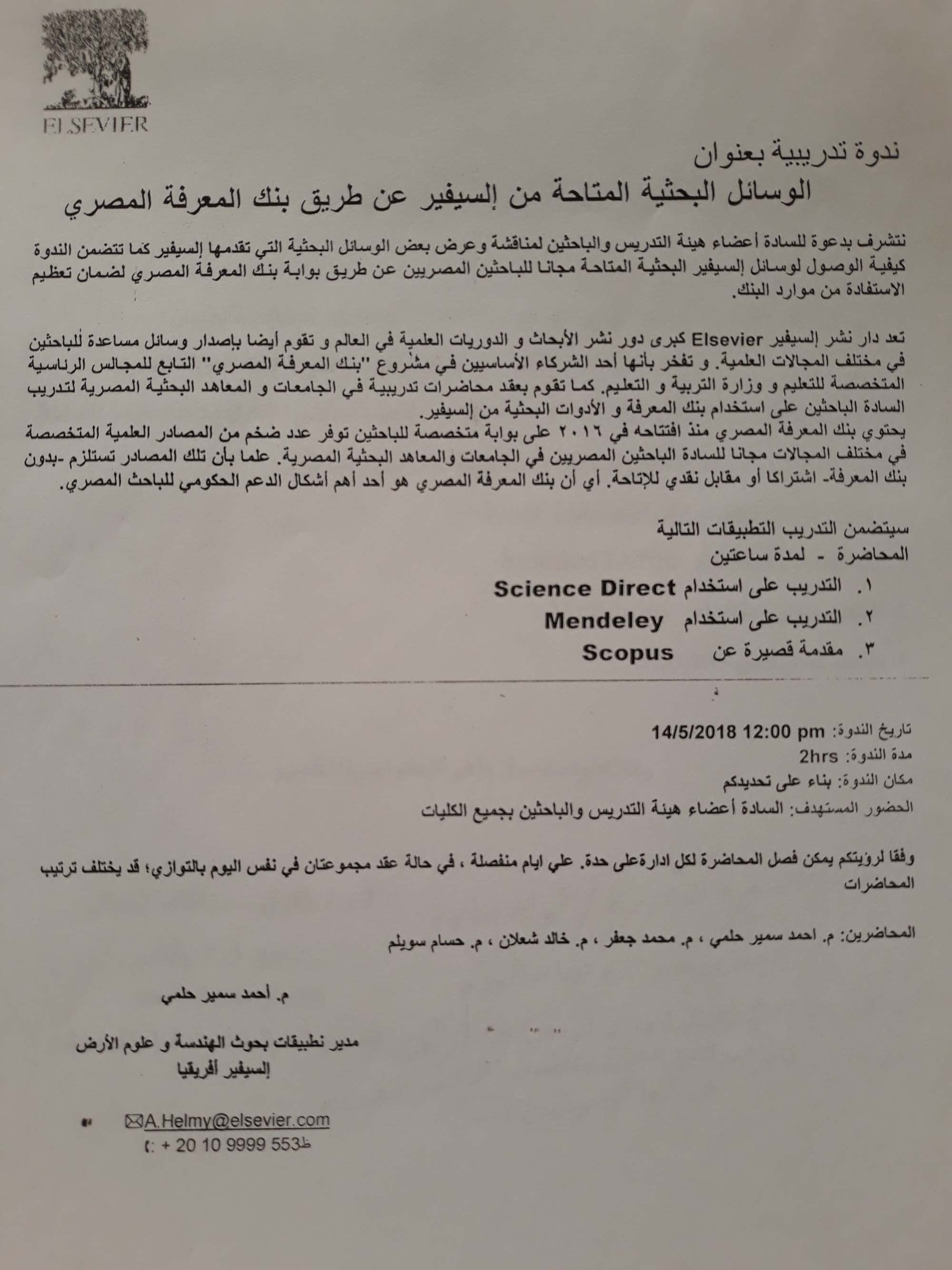 سوف تعقد هذة الندوة يوم الأثنين الموافق 14/5/2018 بقاعة المتحف بالمبنى الادارى بالجامعة من الساعة الثانية عشر ظهراً و لمدة ساعتين