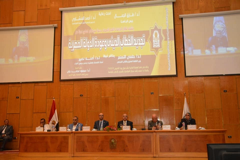 جاء ذلك خلال افتتاح الجامعة لندوتها الثقافية الموسعة حول " تجديد الخطاب الديني وعودة الدولة المصرية " التى ينظمها قطاع الدراسات العليا والبحوث برئاسة الدكتور أحمد المنشاوي نائب رئيس الجامعة لشئون الدراسات العليا والبحوث وبحضور الدكتور محمود محمد علي رئيس قسم الفلسفة بكلية الآداب ورئيس الندوة , ومحمد بشير رئيس حي غرب محافظة أسيوط , وحاضر خلالها كل من الدكتورة آمنة نصير أستاذ الفلسفة والعقيدة بجامعة الأزهر, والأستاذ حلمي النمنم وزير الثقافة السابق , وبمشاركة حشد كبير من القيادات التنفيذية والأمنية وأعضاء مجلس النواب ورجال الدين الاسلامى والمسيحى وعمداء الكليات وأعضاء هيئة التدريس ولفيف من الطلاب من مختلف كليات الجامعة
