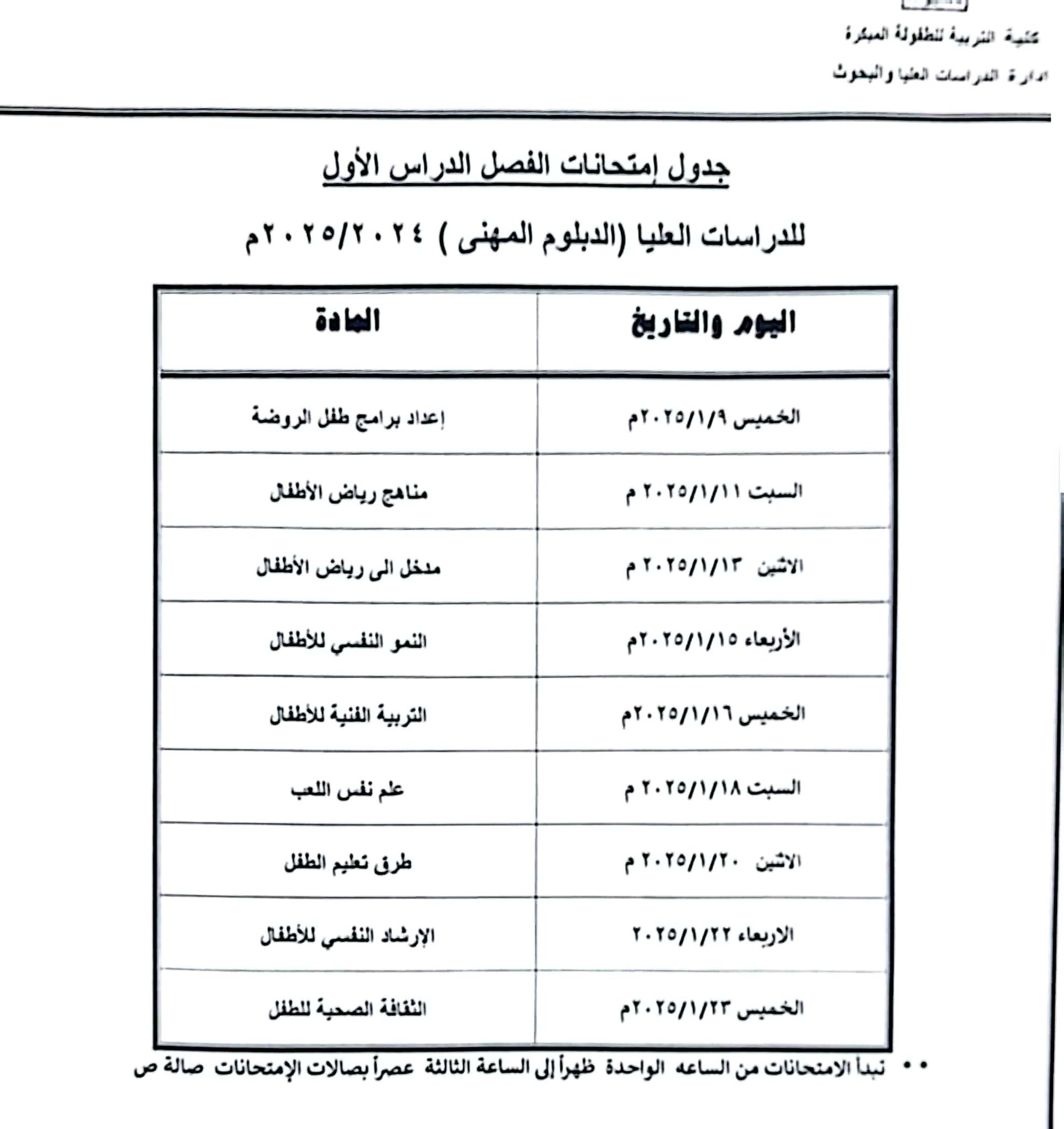 جدول امتحانات الفصل الدراسي الأول للدراسات العليا(الدبلوم الخاص ) 2025/2024