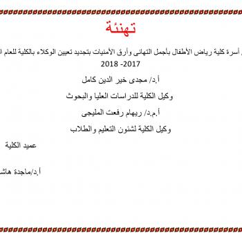 تتقدم أسرة كلية رياض الأطفال بأجمل التهانى وأرق الأمنيات بتجديد تعيين الوكلاء بالكلية للعام الثانى 2017- 2018 أ.د/ مجدى خير الدين كامل  وكيل الكلية للدراسات العليا والبحوث أ.م.د/ ريهام رفعت…