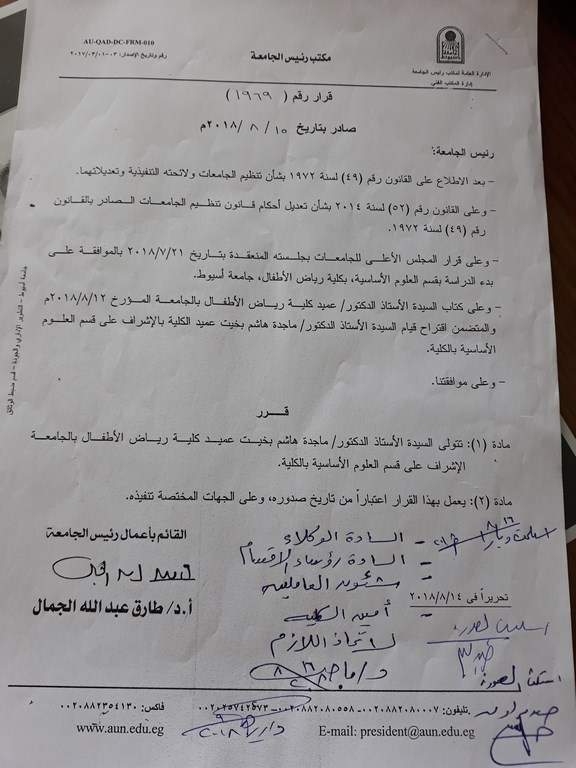 وافق أ.د/ طارق الجمال رئيس جامعة أسيوط على بدء الدراسة بقسم العلوم الأساسية بكلية رياض الأطفال على أن تتولى أ.د/ماجدة هاشم بخيت عميد الكلية الإشراف على القسم و تتقدم أسرة كلية رياض الأطفال لسيادتها بالتهنئة متمنين لسيادتها دوام التوفيق و لكلية رياض الأطفال المزيد من التقدم و الرقى