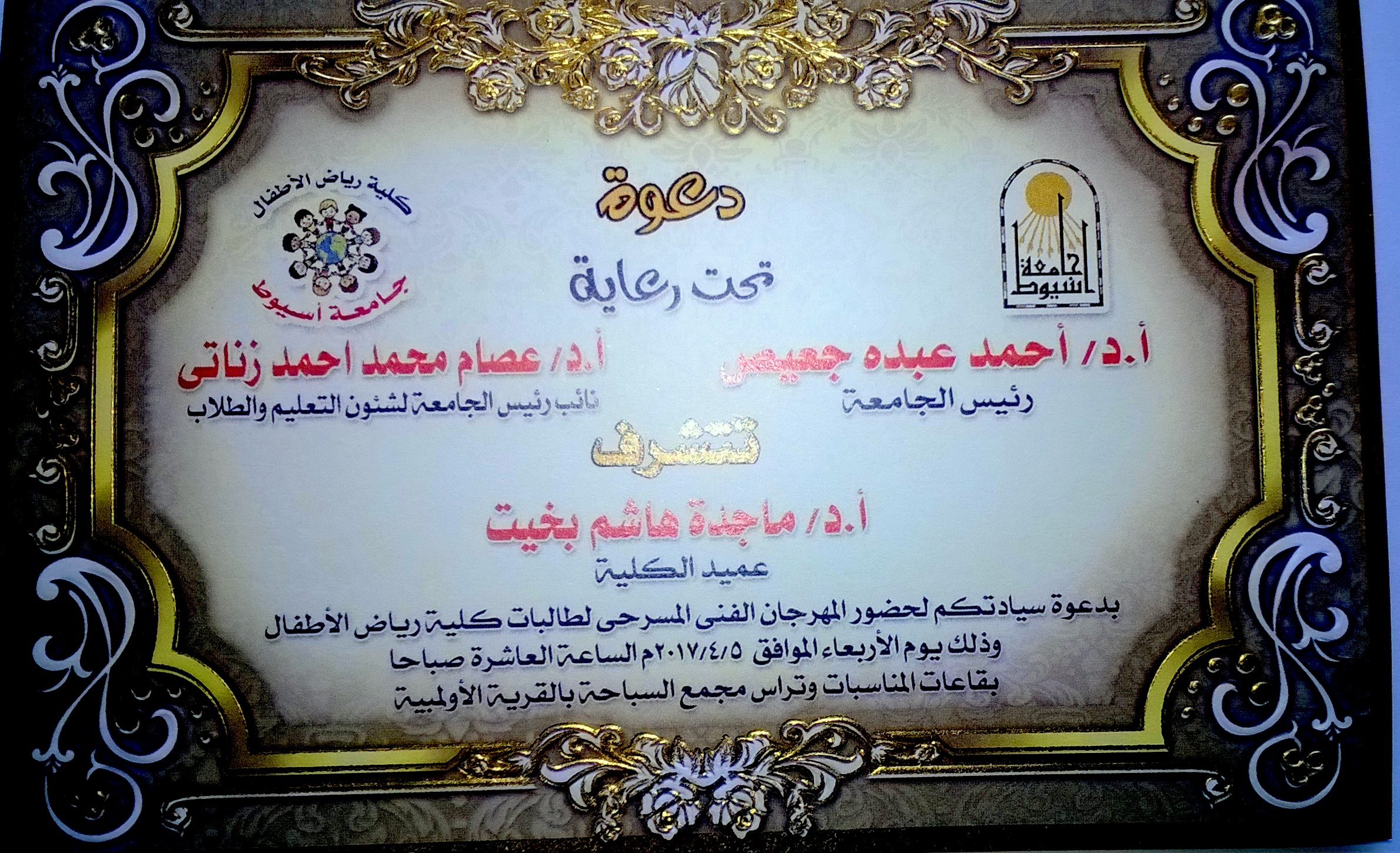 بدعوة جميع أعضاء هيئة التدريس و الطلاب لحضور المهرجان الفنى المسرحى لطالبات كلية رياض الأطفال