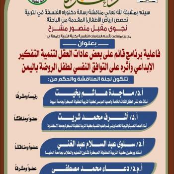 God willing, the discussion of the doctoral thesis of the researcher / Najwa Moqbel Mansour will be held