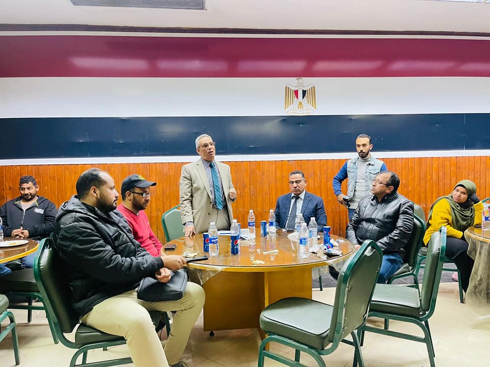 Mr. Abdulqader Mehran, the secretary of the college, and Mr. Tarek Sharit, the director of youth care for the students of the workshops in the theatrical performance at the palace of culture of Assiut about one of the martyrs