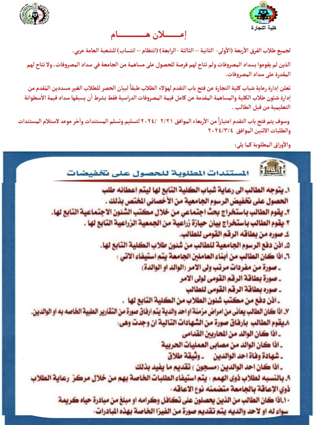 اعلان هام لجميع طلاب الفرق الاربعة من الفرقة الاولى وحتى الفرقة الرابعة للشعبة العامة عربي للطلاب الغير مسددين للكارنية الجامعى والمصروفات الدراسية 20 فبراير 2024