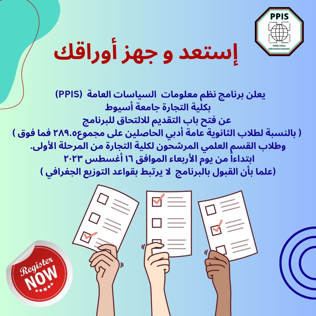 يعلن برنامج نظم معلومات السياسات العامة (PPIS) بكلية التجارة جامعة أسيوط عن فتح باب التقديم للالتحاق للبرنامج ( بالنسبة لطلاب الثانوية عامة أدبي الحاصلين على مجموع٢٨٩.٥ فما فوق) وطلاب القسم العلمي المرشحون لكلية التجارة من المرحلة الأولى.