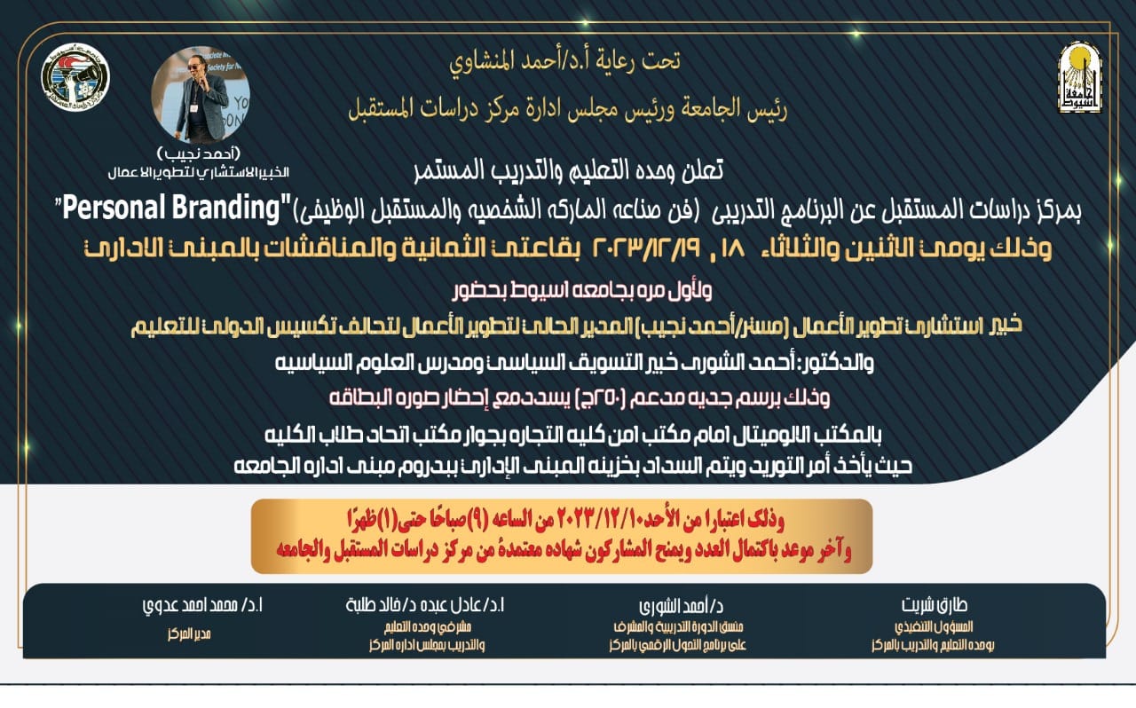 تعلن وحدة التعليم والتدريب المستمر بمركز دراسات المستقبل عن البرنامج التدريبي "فن صناعة الماركة الشخصية والمستقبل الوظيفي Personal Branding" وذلك يومي الإثنين والثلاثاء ١٨ و ١٩ /١٢/ ٢٠٢٣ بقاعتي الثمانية والمناقشات بالمبنى الإداري ولأول مرة بجامعة أسيوط بحضور استشاري تطوير الأعمال مستر أحمد نجيب المدير الحالي لتطوير الأعمال لتحالف تكسيس الدولي للتعليم ، والدكتور أحمد الشورى خبير التسويق السياسي ومدرس العلوم السياسية ، وذلك برسم جدية مدعم ( ٢٥٠ ) جنيه يسدد مع إحضار صورة البطاقة بالمكتب الألوميتال أمام مكتب أمن كلية التجارة بجوار مكتب اتحاد طلاب الكلية ، حيث يؤخذ أمر التوريد ويتم السداد بخزينة المبنى الإداري ببدروم مبنى إدارة الجامعة ، وذلك اعتبارا من الأحد ١٠/ ١٢/ ٢٠٢٣ من الساعة التاسعة صباحا حتى الواحدة ظهرا .