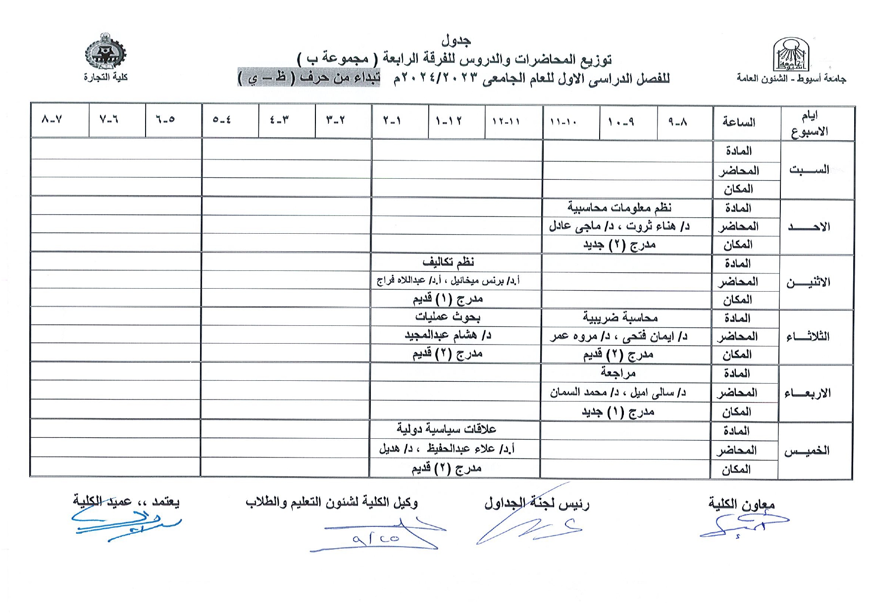 جداول محاضرات الفصل الدراسى الاول للعام الجامعى 2023/2024 الفرقة الرابعة مجموعه ب من احرف ط الى ى 27 سبتمبر 2023