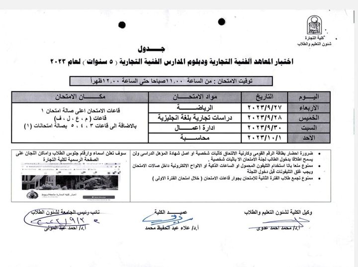جدول اختبارات المعاهد الفنية التجارية و دبلوم المدارس الفنية 5 سنوات) لعام 2023