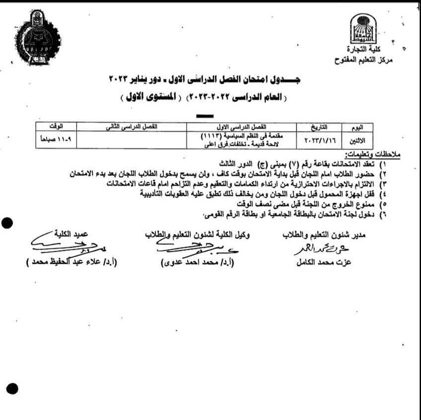 جدول إمتحان الفصل الدراسى الأول _ دور يناير2023 (المستوى الاول/ التعليم المفتوح)