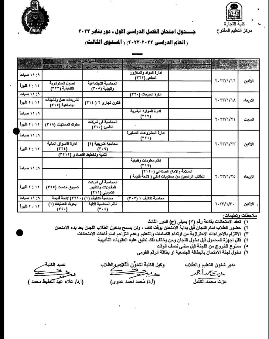 جدول إمتحان الفصل الدراسى الأول _ دور يناير2023 (المستوى الثالث / التعليم المفتوح)