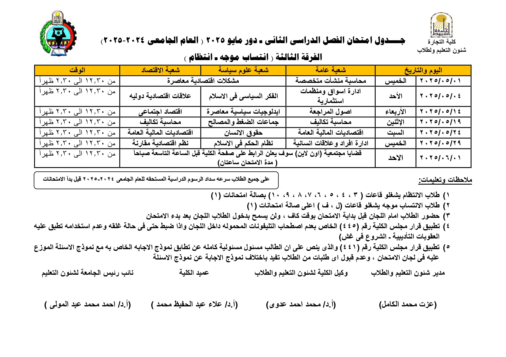 جدول امتحان الفصل الدراسى الثانى - دور مايو 2025 (العام الجامعى 2024-2025) الفرقة الثالثة ( انتساب موجه - انتظام ) 14 يوليو 2025
