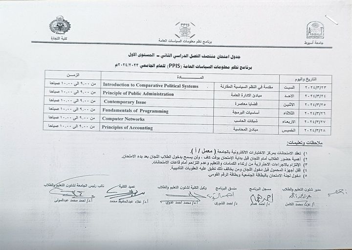 جدول إمتحان منتصف الفصل الدراسي الثاني برنامج نظم معلومات السياسات العامة (PPIS) "المستوي الأول" للعام الجامعي ٢٠٢٤/٢٠٢٣ م 10 مارس 2024