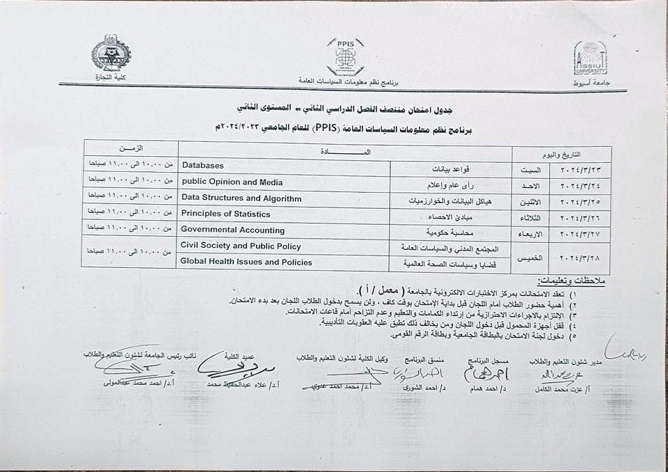 جدول إمتحان منتصف الفصل الدراسي الثاني برنامج نظم معلومات السياسات العامة (PPIS) "المستوي الثاني" للعام الجامعي ٢٠٢٤/٢٠٢٣ م 10 مارس 2024