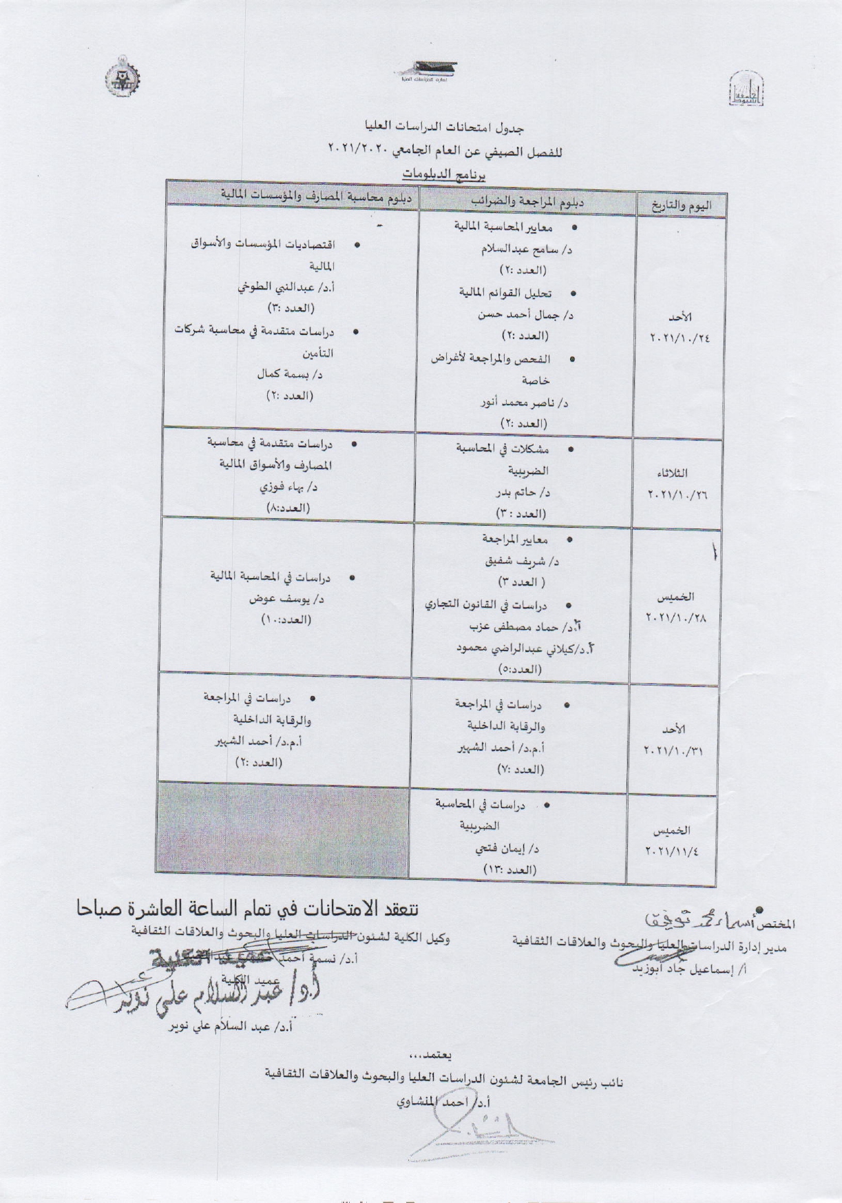 جدول إمتحانات الدراسات العليا برنامج الدبلومات