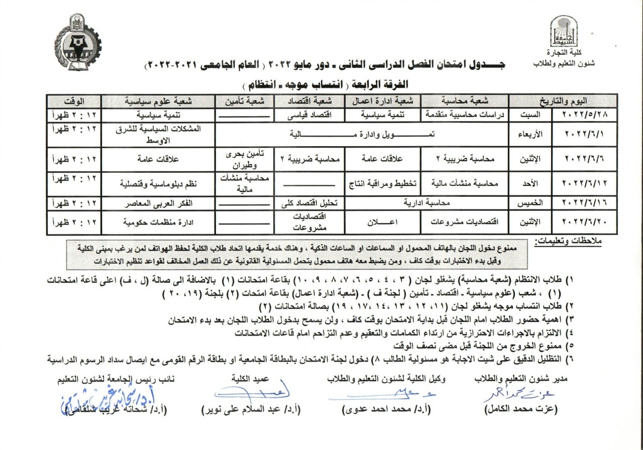 جدول امتحان الفصل الدراسى الثانى - دور مايو 2025 (العام الجامعى 2024-2025) الفرقة الرابعة ( انتساب موجه - انتظام )