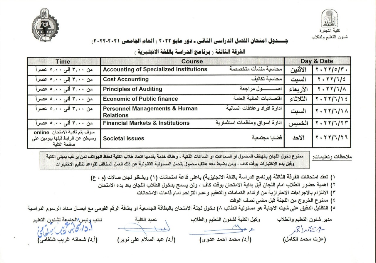 جدول امتحان الفصل الدراسى الثانى - دور مايو 2025 (العام الجامعى 2024-2025) الفرقة الثالثة ( انتساب موجه - انتظام )