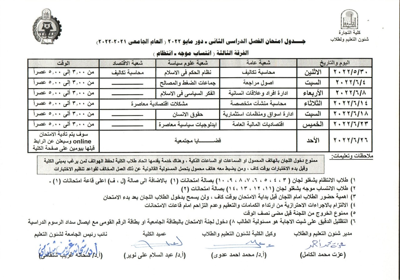 جدول إمتحانات الفرقة الثالثة - الفصل الدراسى الثانى 2021/2022 (عربى)