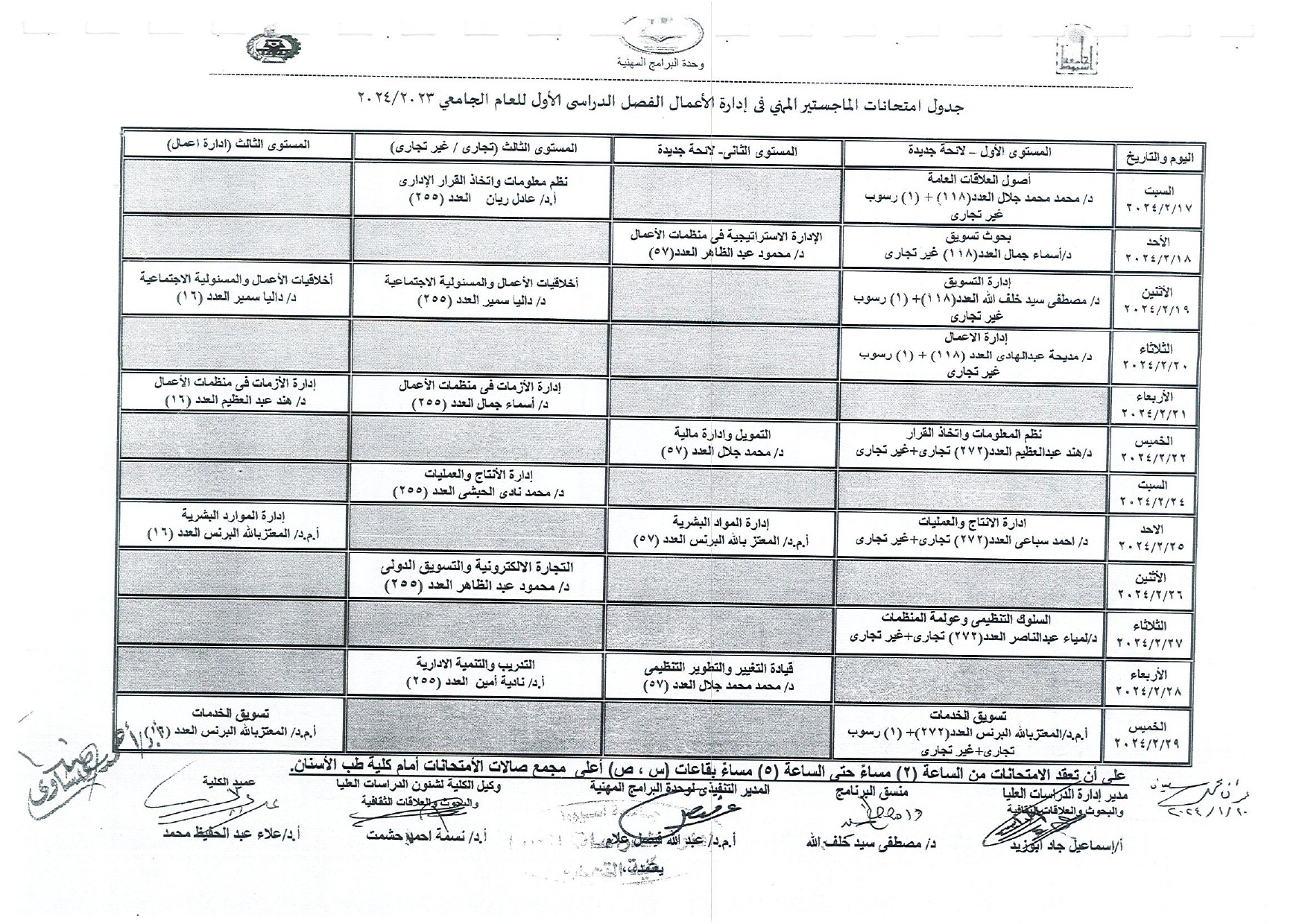 جدول امتحانات الماجستير المهنى فى إدارة الاعمال الفصل الدراسى الاول 2024/2023