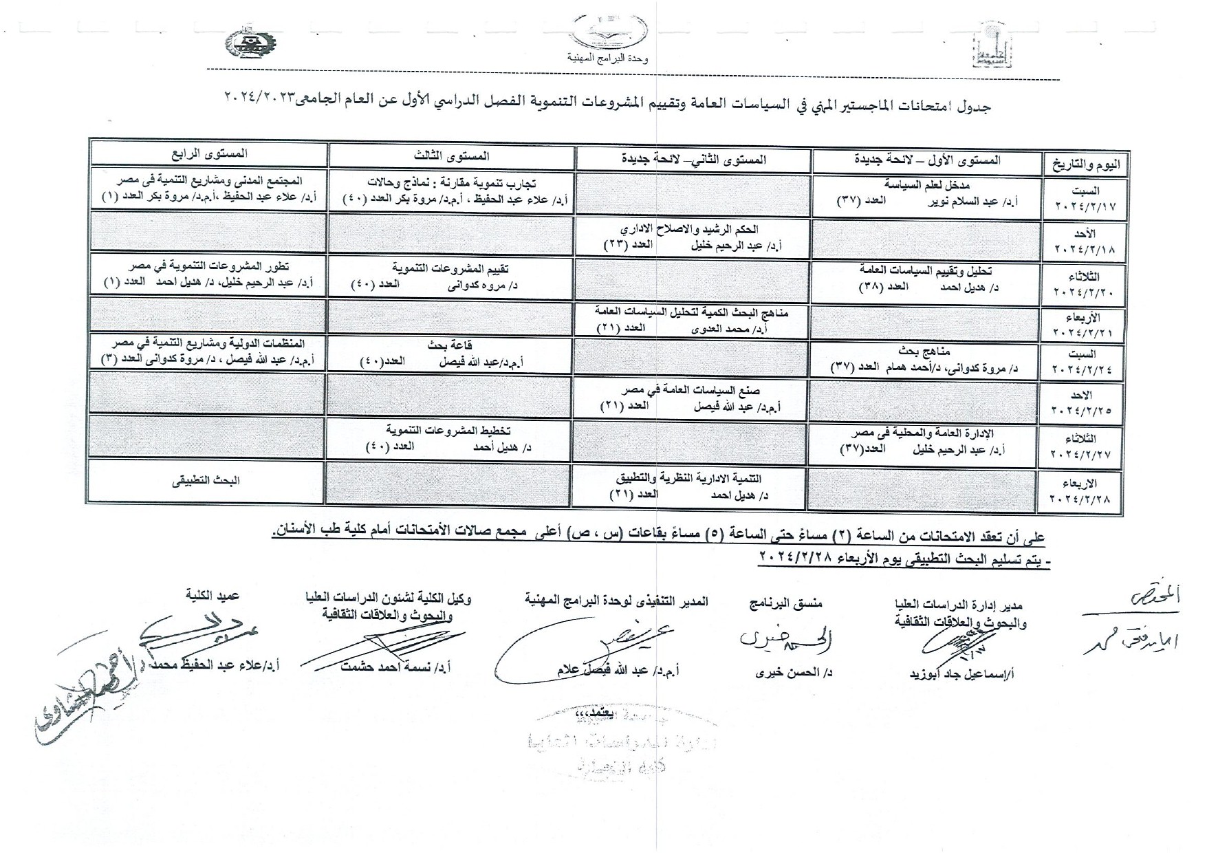 جدول امتحانات الماجستير المهنى فى السياسات العامة الفصل الدراسى الاول 2024/2023