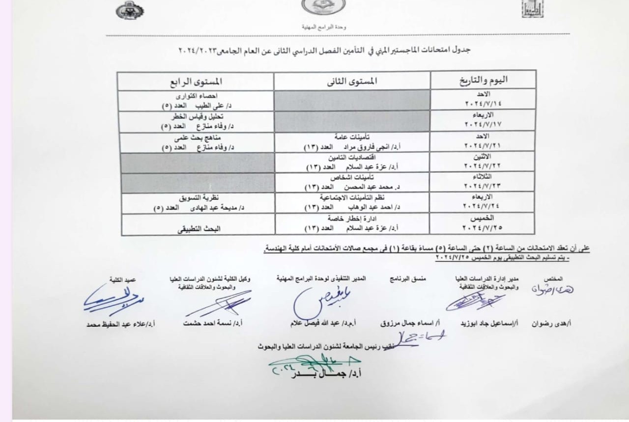 جدول امتحان الفصل الدراسى الثانى - دور مايو 2025 (العام الجامعى 2024-2025) الفرقة الرابعة ( انتساب موجه - انتظام )