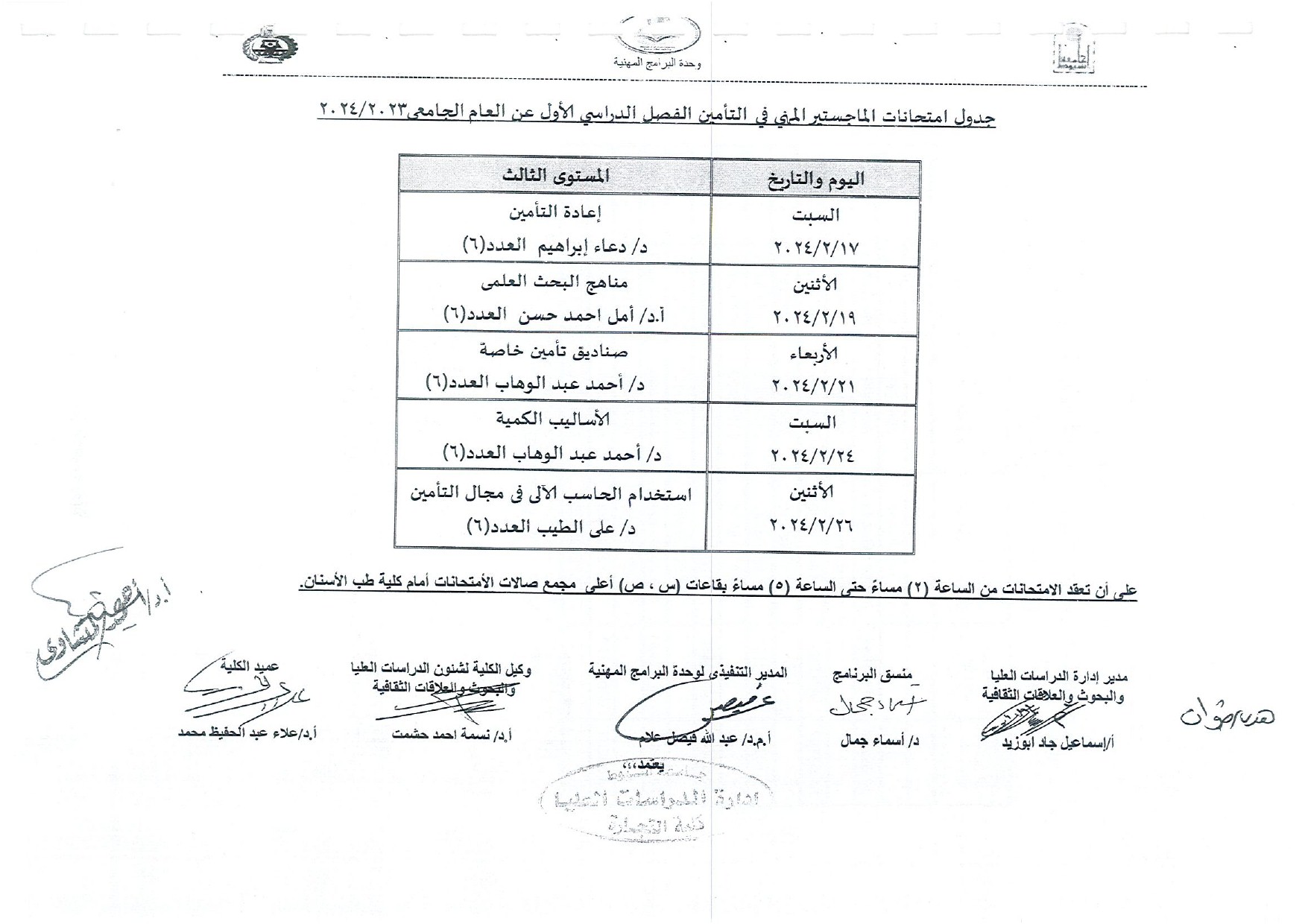جدول امتحانات الماجستير المهنى فى التأمين الفصل الدراسى الاول 2024/2023