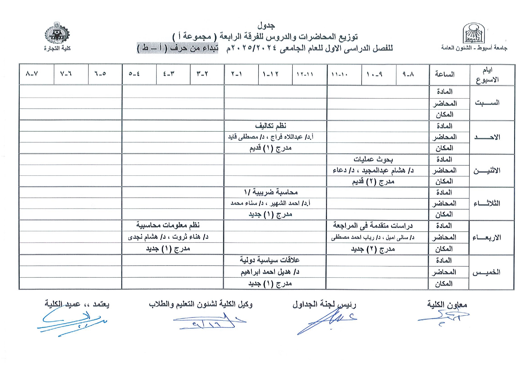 جدول محاضرات االفرقة الرابعة مجموعة (ا) الفصل الدراسى الأول للعام الجامعى 2025/2024
