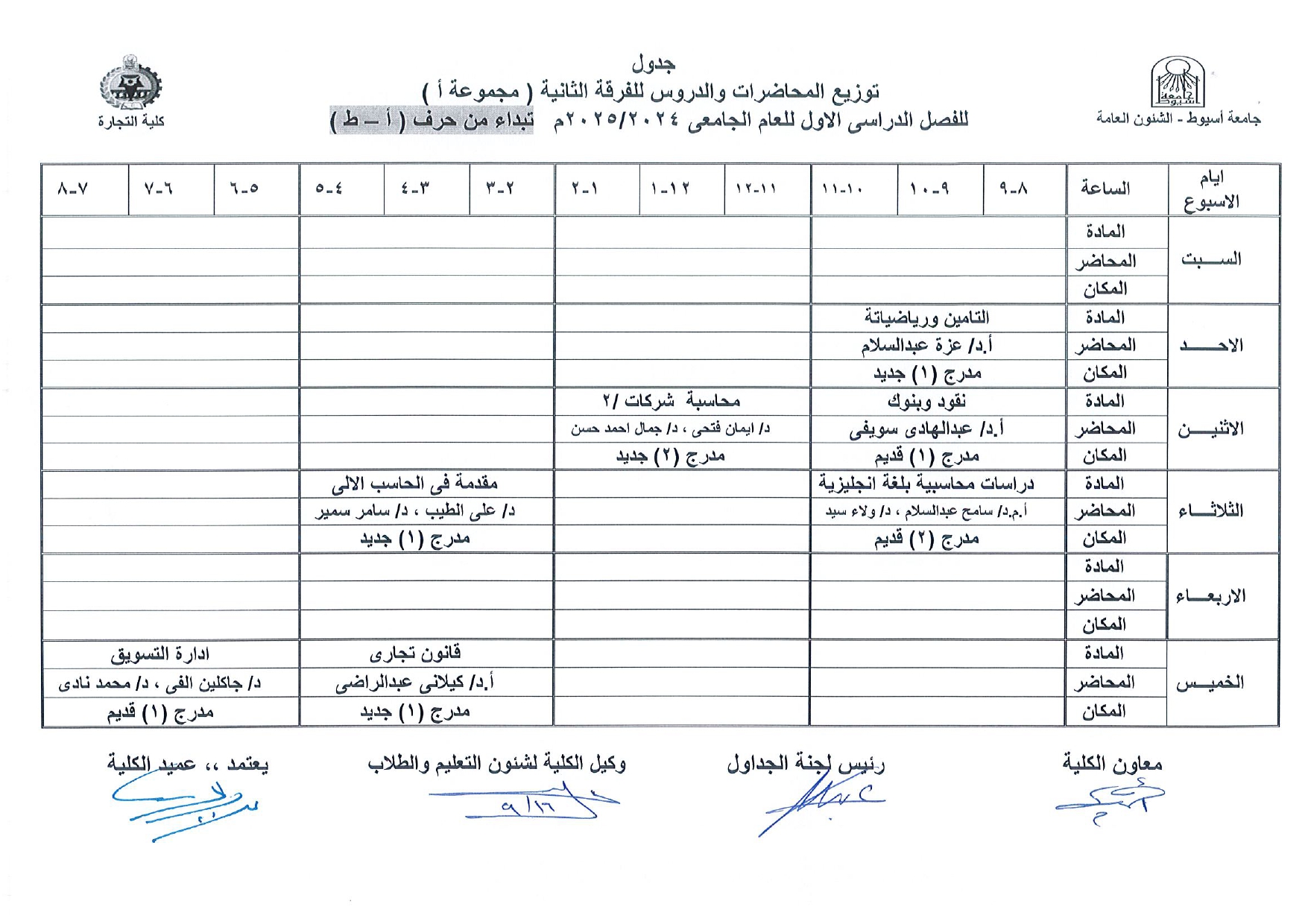 جدول محاضرات االفرقة الثانية مجموعة (أ) الفصل الدراسى الأول للعام الجامعى 2025/2024