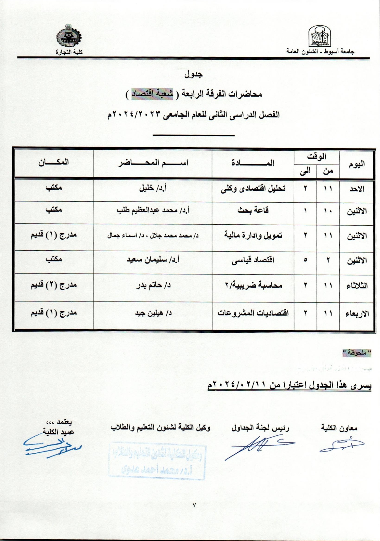 جدول محاضرات الفرقة الرابعة (شعبة إقتصاد)