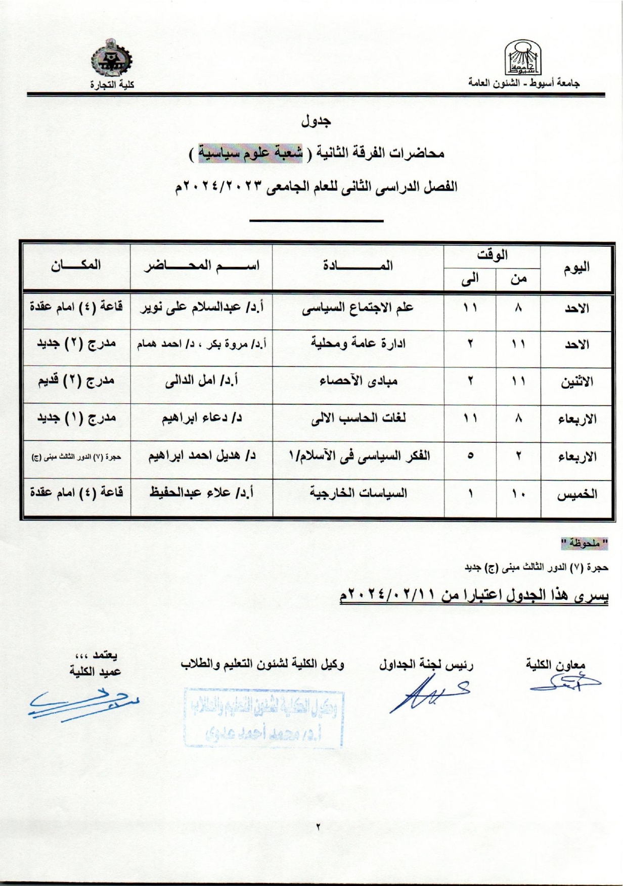 جدول محاضرات الفرقة الثانية (شعبة علوم سياسية)