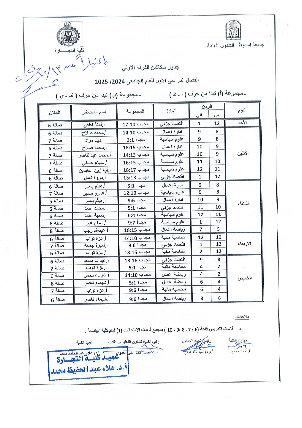جدول سكاشن الفرقة الأولى الفصل الدراسى الأول للعام الجامعى 2025/2024
