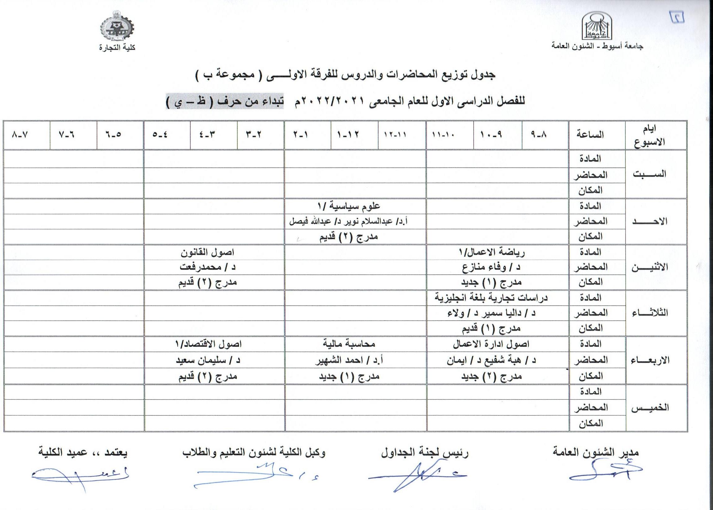جدول توزيع المحاضرات للفرقة الأولى مجموعة (ب)