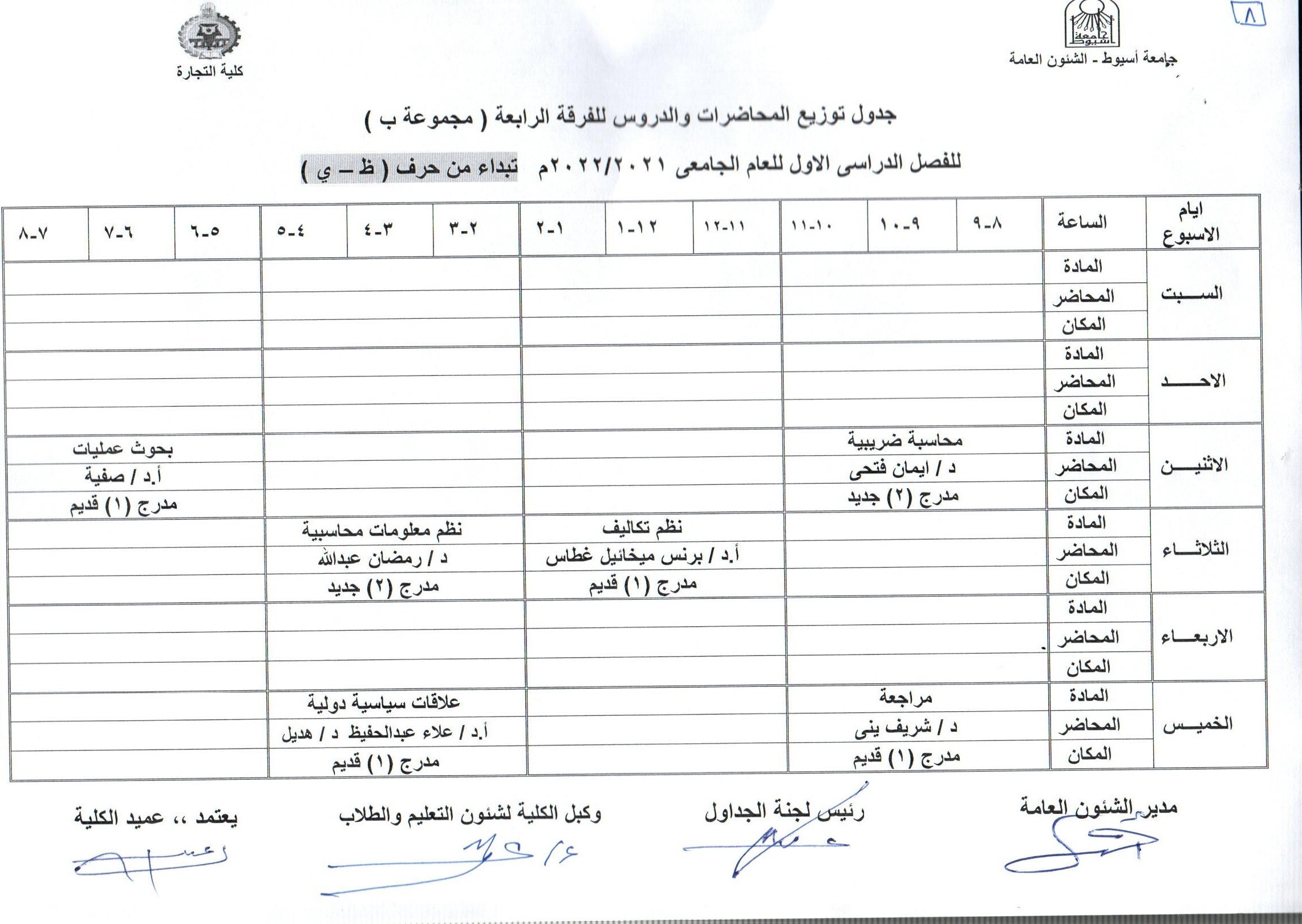 جدول توزيع المحاضرات للفرقة الرابعة مجموعة (ب)
