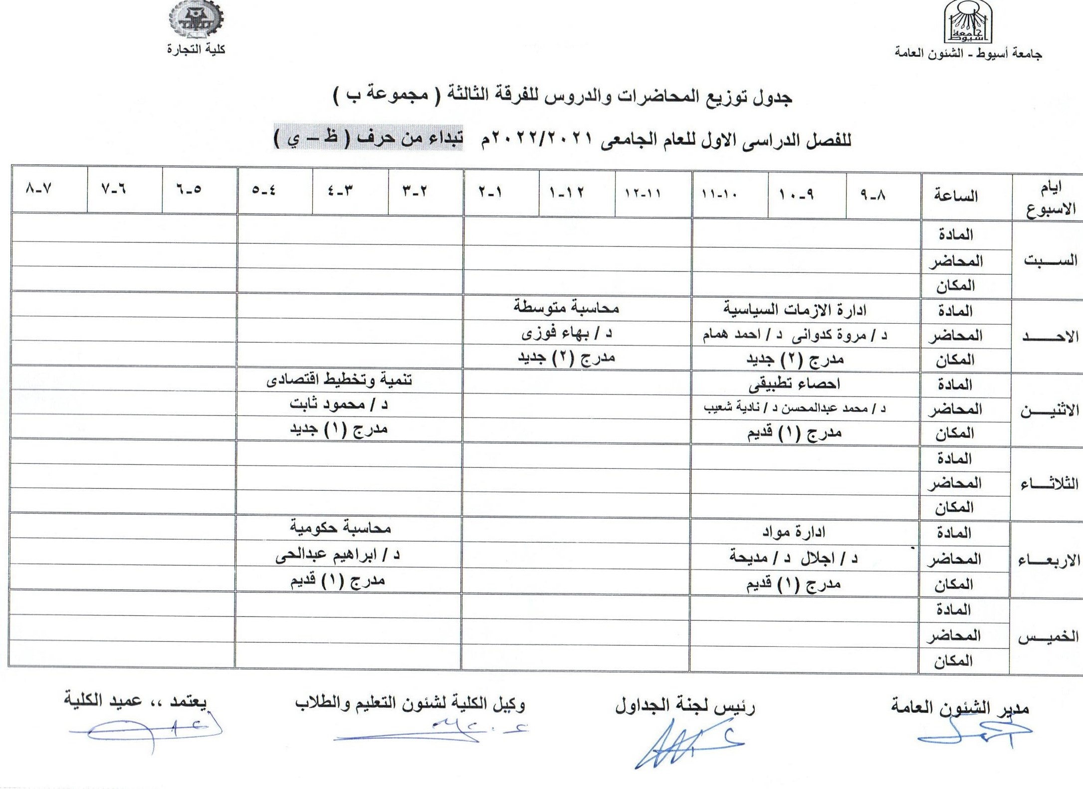 جدول توزيع المحاضرات للفرقة الثالثة مجموعة (ب)
