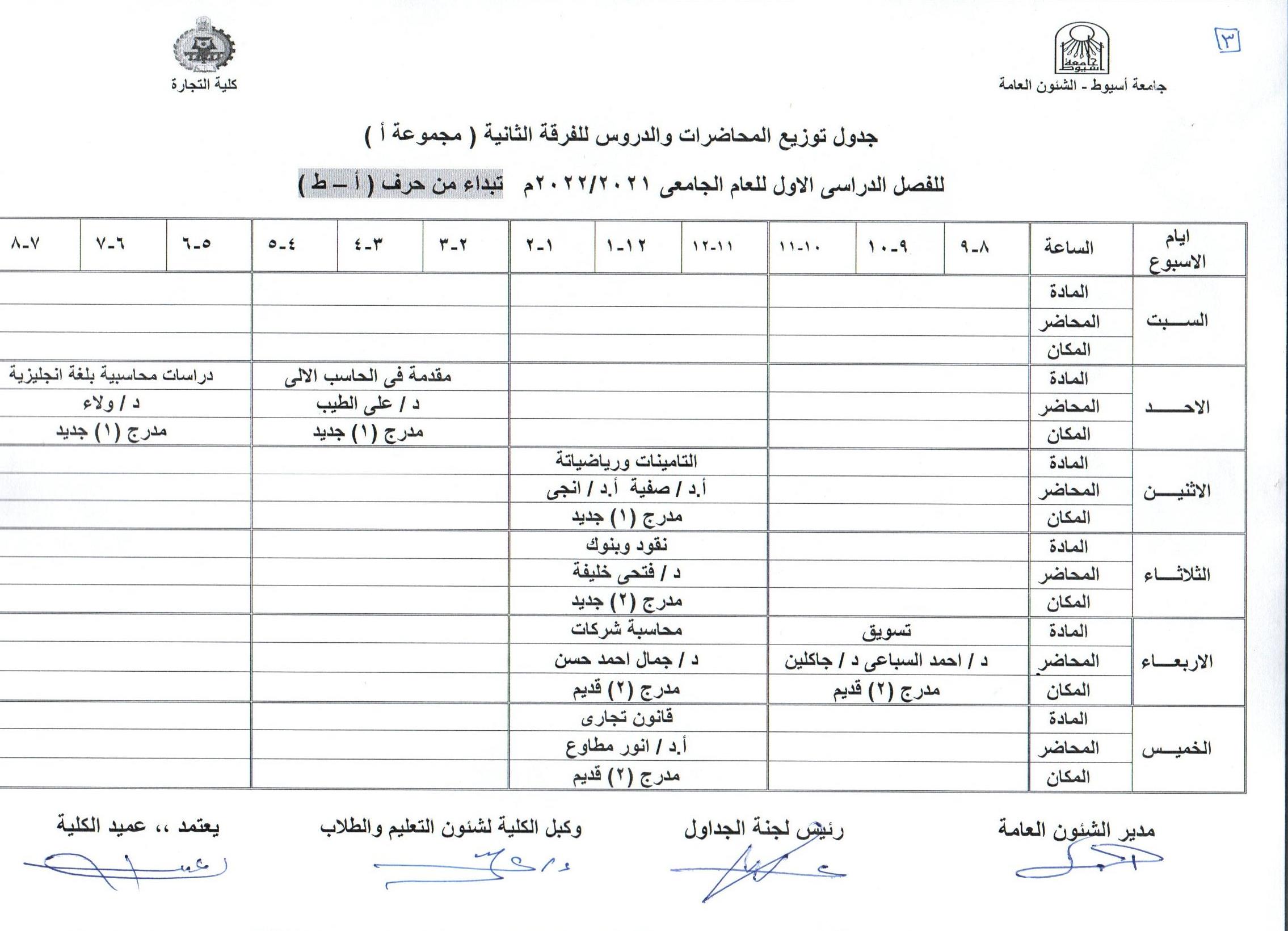 جدول توزيع المحاضرات للفرقة الثانية مجموعة (أ)