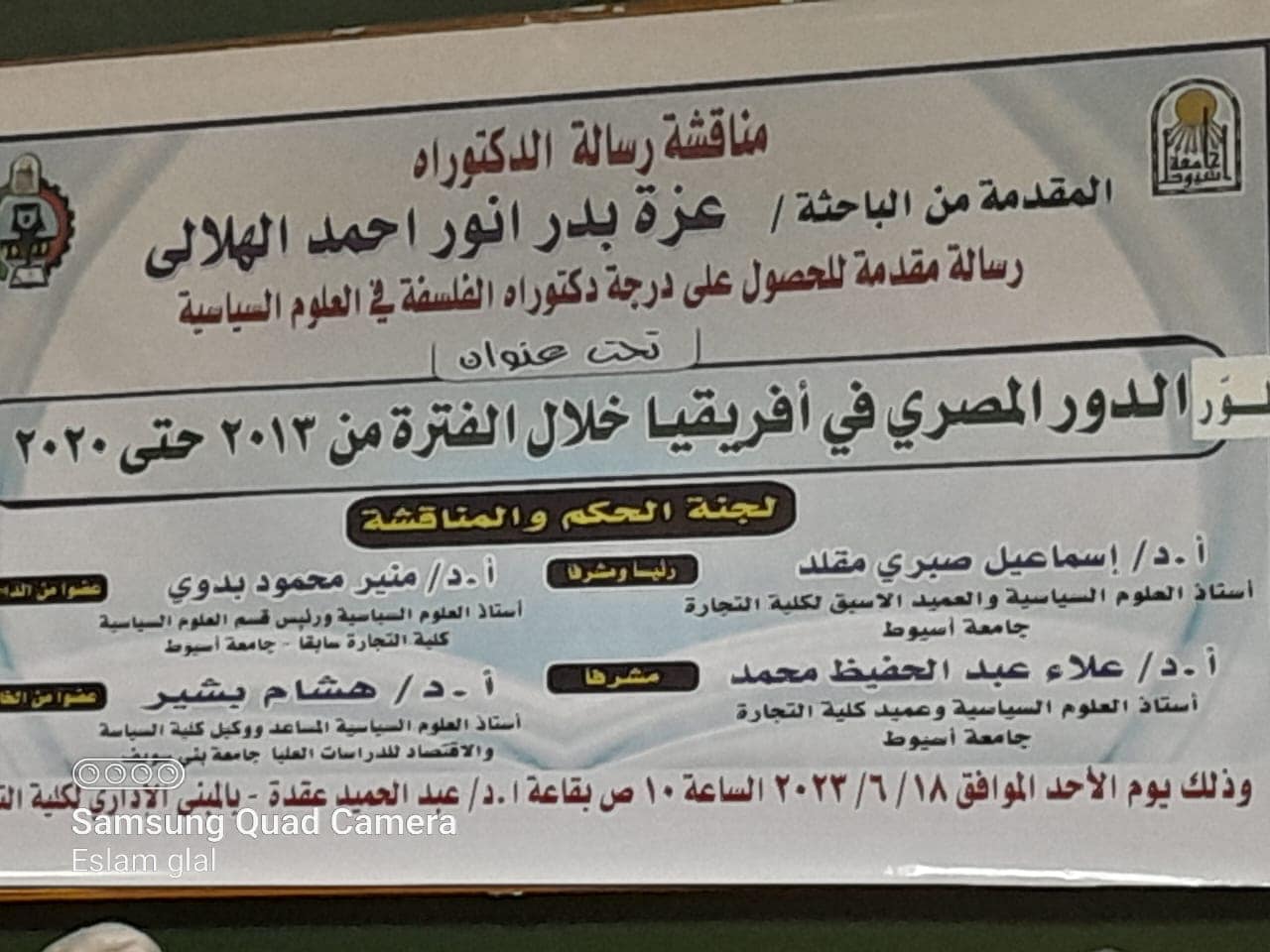 مناقشات 18 يونيو 2023 بحضور معالي أ.د/ علاء عبد الحفيظ عميد الكلية ولفيف من أعضاء هيئة التدريس بالكلية. تم مناقشة رسالة الدكتوراه في (مسار النظم السياسية المقارنة ) للباحثة/ عزه بدر انور متمنين لها دوام التوفيق و النجاح