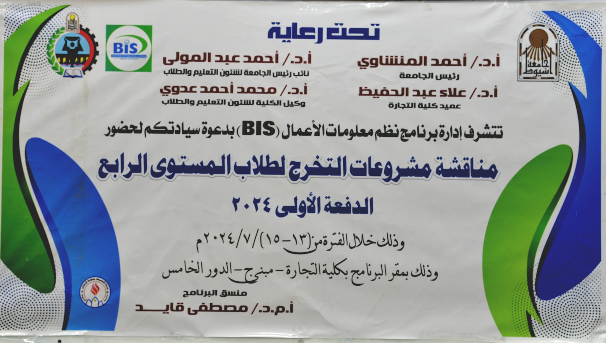 مناقشة مشروعات تخرج الدفعة الأولى من برنامج نظم معلومات الأعمال BIS بمشاركة خبراء متخصصين من أساتذة تكنولوجيا المعلومات بالجامعة، وخبراء التكنولوجيا.