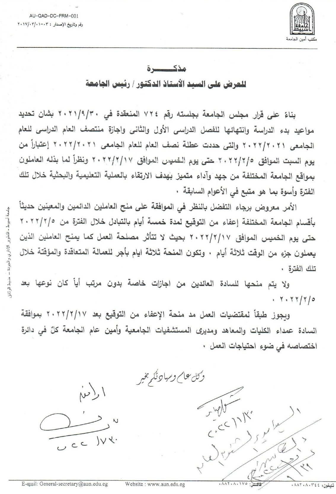مواعيد حضور و إنصراف العاملين الدائمين فى أجازة منتصف العام الدراسى