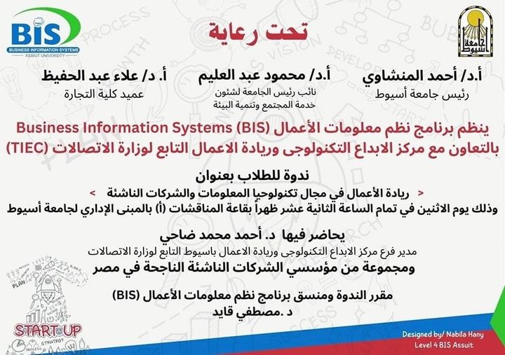 تحت رعاية الأستاذ الدكتور أحمد المنشاوي رئيس جامعة أسيوط، والأستاذ الدكتور محمود عبد العليم نائب رئيس الجامعة لشئون خدمة المجتمع وتنمية البيئة، والأستاذ الدكتور علاء عبد الحفيظ عميد كلية التجارة، ينظم برنامج نظم معلومات الأعمال BIS بالتعاون مع مركز الإبداع التكنولوجى وريادة الأعمال باسيوط التابع لوزارة الاتصالات ندوة بعنوان "ريادة الأعمال في مجال تكنولوجيا المعلومات والشركات الناشئة" وذلك يوم الاثنين ٤ سبتمبر ٢٠٢٣ في تمام الساعة الثانية عشر ظهراً بقاعة المناقشات (أ) بالمبنى الإداري لجامعة أسيوط.