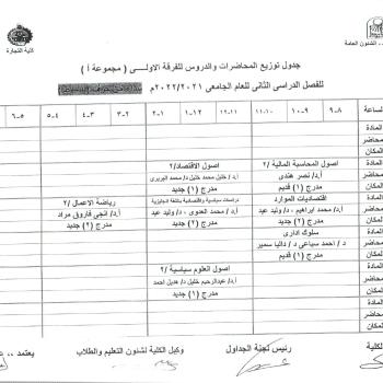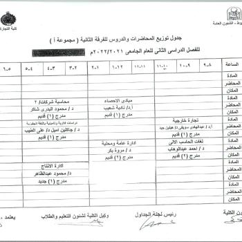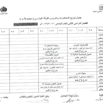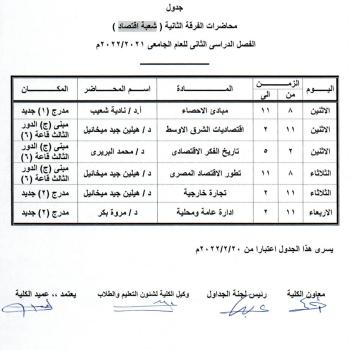 جداول محاضرات الفصل الدراسى الثانى الفرقة الثانية شعبة الاقتصاد للعام الجامعى 2022/2021