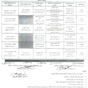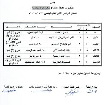 جداول محاضرات الفصل الدراسى الثانى الفرقة الثانية شعبة العلوم السياسية للعام الجامعى 2022/2021